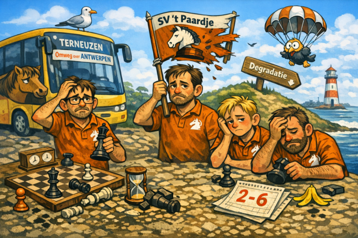 Ook in de slotronde van de Zaterdagcompetitie van de KNSB ging het achttal van SV ’t Paardje onderuit. De verre reis naar Terneuzen, via Antwerpen vanwege een gesloten tunnel, leverde...Verder lezen→