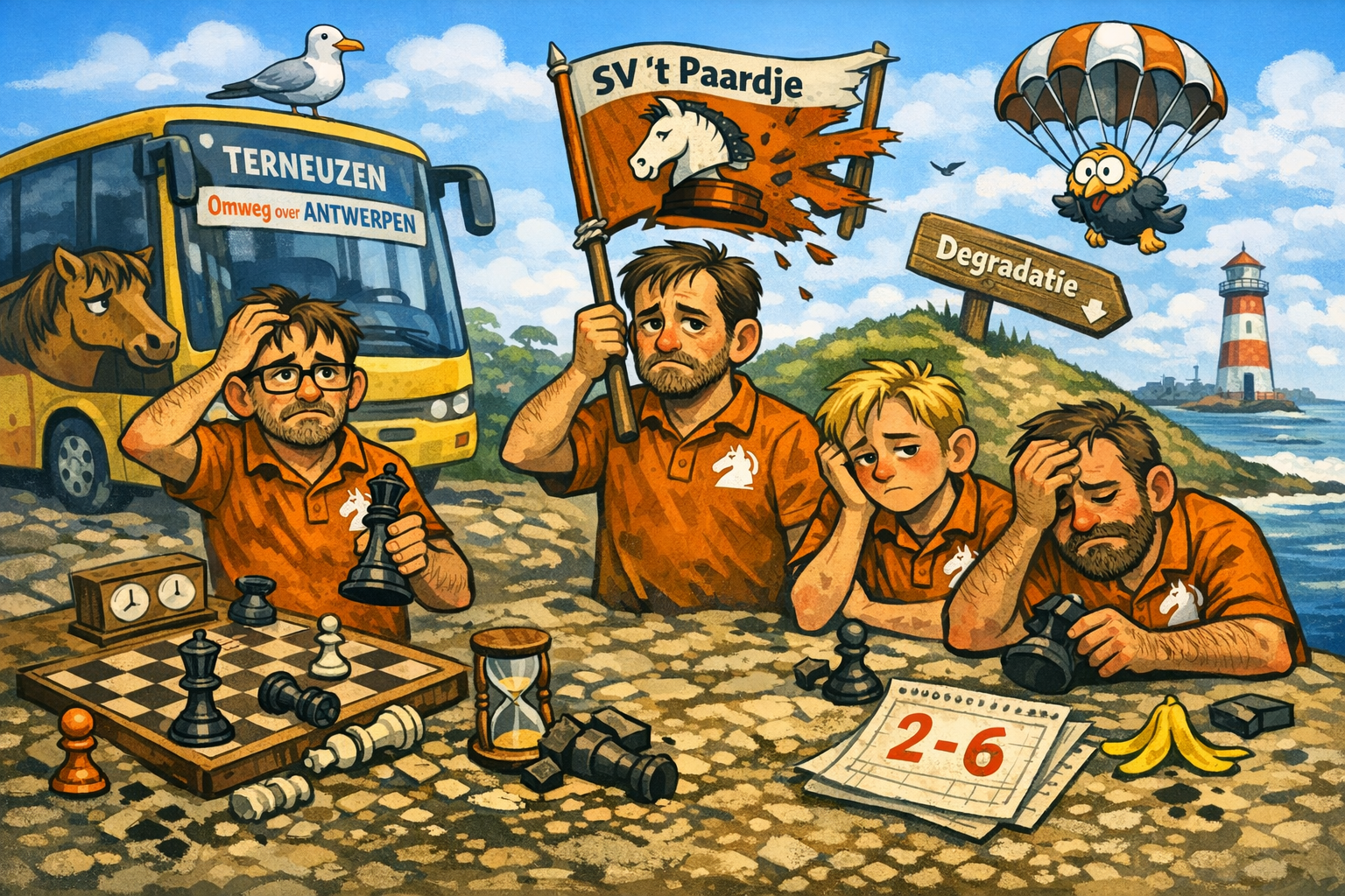 Ook in de slotronde van de Zaterdagcompetitie van de KNSB ging het achttal van SV ’t Paardje onderuit. De verre reis naar Terneuzen, via Antwerpen vanwege een gesloten tunnel, leverde wel twee bordpunten op. De twee achtereenvolgende promoties kwamen duidelijk te snel want er werden liefst acht wedstrijden verloren. Het “hoogtepunt” was het gelijke spel tegen De Pion 1 uit Roosendaal.