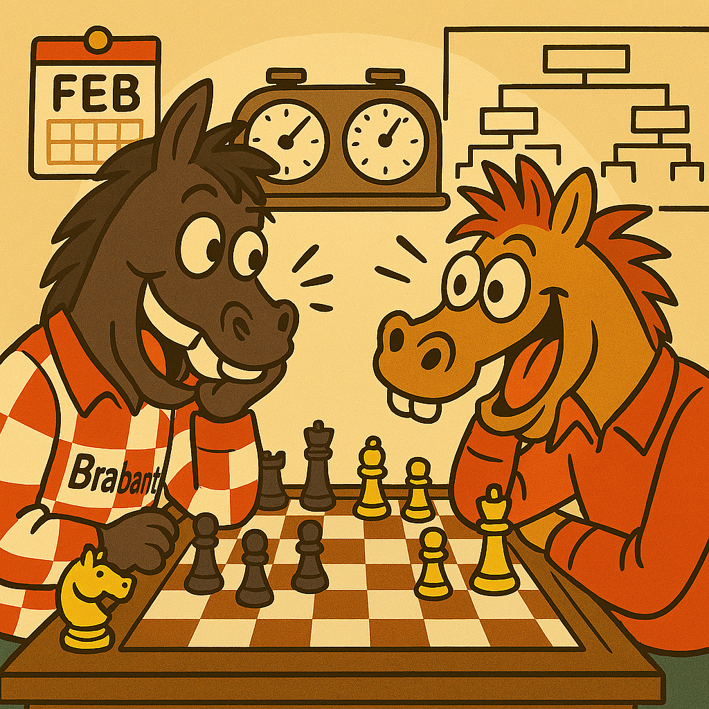 Cruciale week voor Avondteams ’t PaardjeDeze week spelen zowel ’t Paardje A als ’t Paardje B de laatste wedstrijd in de Avondcompetitie van de Noord-Brabantse Schaakbond. Beide teams komen uit in de eerste klasse en zitten bovendien in dezelfde poule. Om competitievervalsing te voorkomen is het onderlinge treffen reeds in een eerder stadium afgewerkt. Zowel ’t Paardje A als ’t Paardje B hebben zes matchpunten; ’t Paardje A heeft echter twee bordpunten meer. Aangezien de hekkensluiter vier matchpunten heeft is degradatie, ondanks de huidige tweede en derde plaats op de ranglijst, nog steeds mogelijk.