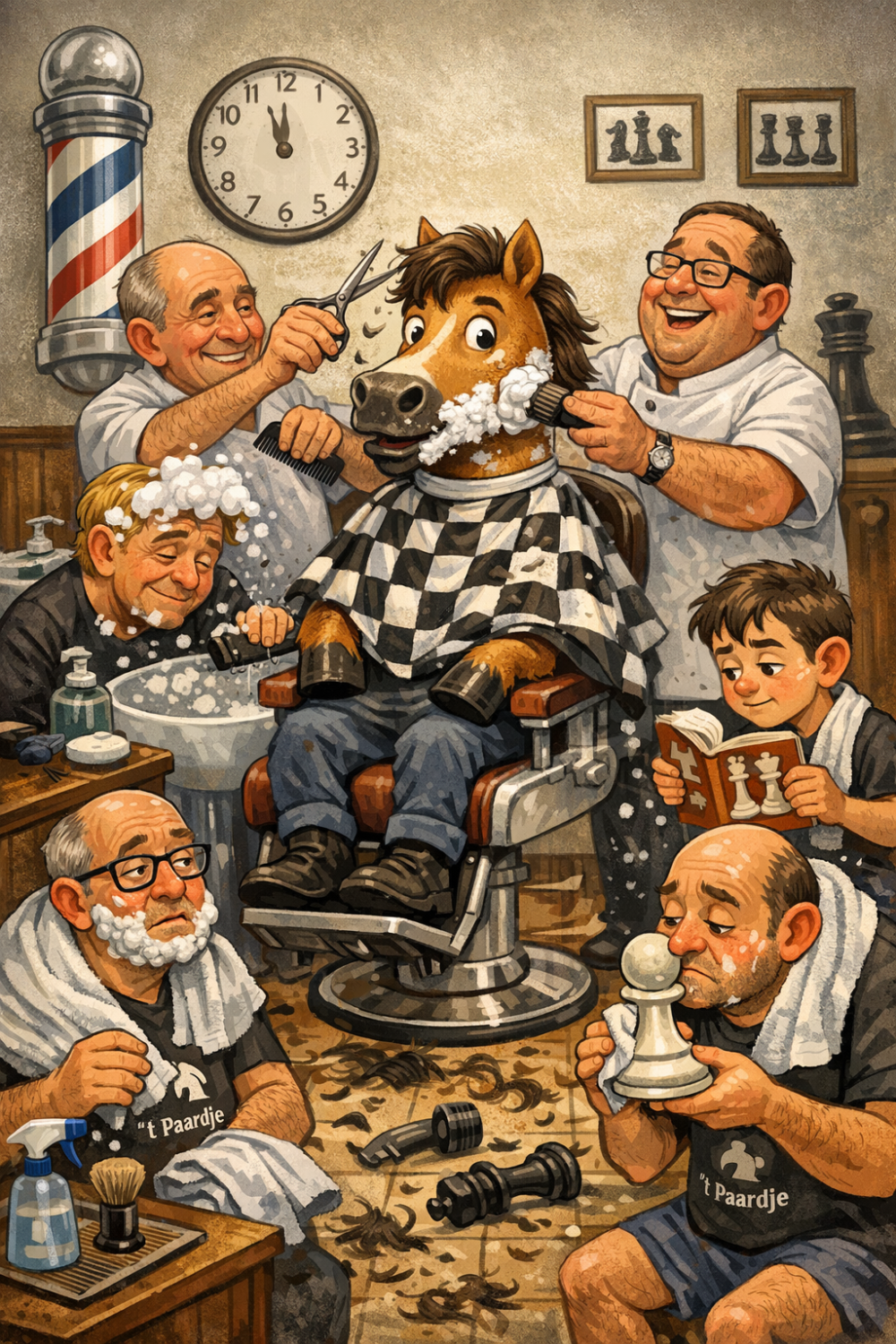 Het bezoek aan Charlois Europoort in Rotterdam leverde voor het Zaterdagteam, dat speelt in de vierde klasse van de KNSB, van alles op behalve punten. De toekomstig kampioen was op alle borden een maatje te groot. Geen schande gezien het ELO verschil van ruim 300 punten per speler. Het was wel een nieuwe ervaring om de strijd aan te gaan met dergelijk sterke spelers. Bovendien keerden “de paardjes” fris en fruitig huiswaarts want nog nooit werden ze zo vakkundig geknipt, gewassen en geschoren.